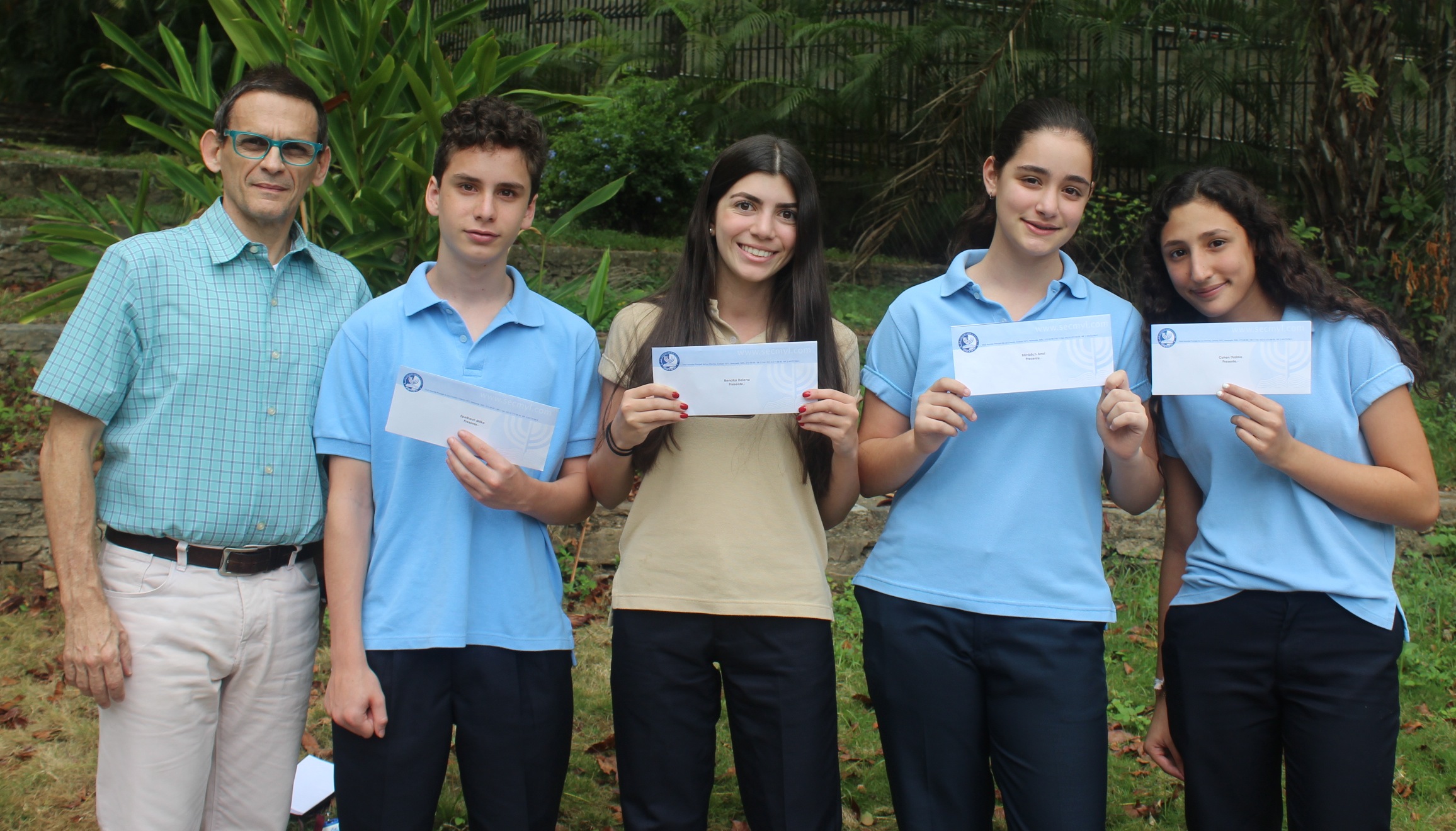 El profesor Ítalo Pecora, coordinador del Departamento de Matemática del colegio, junto a Mike Epelbaum, Helena Benatar, Anat Bimblich y Thalma Cohen, cuatro de los ganadores en la Olimpíada Matemática