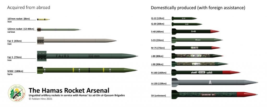 Las Fuerzas de Defensa de Israel estiman que, antes de la actual ronda de combates, Hamás disponía de un arsenal de 7000 cohetes de distinto alcance que pueden cubrir casi todo Israel, así como de 300 misiles antitanque y 100 proyectiles antiaéreos. También ha adquirido decenas de vehículos aéreos no tripulados, y cuenta con un ejército de unos 30.000 militantes, incluidos 400 comandos navales.
