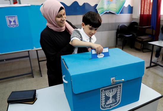Haciendo uso de su particular apartheid, una mujer árabe israelí deposita su voto en abril pasado con ayuda de su hijo. Seguramente volverá a hacerlo en septiembre (foto: PorIsrael)