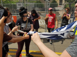 Alguien del público, a quien por lo visto le queda algo de raciocinio, le preguntó a los “antisionistas” al ver la bandera en llamas: “¿Qué son ustedes? ¿Están contra los judíos?”. A lo que contestaron: “Nadie está contra nadie sino contra el colonialismo imperial”, iniciando una enredada arenga sobre lo que el gobierno de EEUU le hizo a los indígenas norteamericanos, vinculándolo con los judíos y los palestinos.
