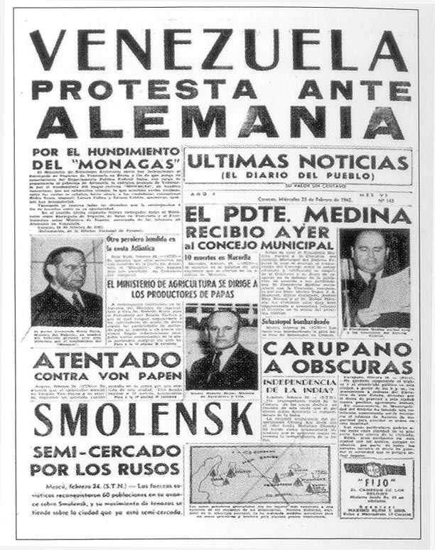 Primera plana del diario caraqueño Últimas Noticias del 18 de febrero de 1942, que destacaba el hundimiento del tanquero venezolano Monagas por un submarino alemán (fuente: Venezuela y la Segunda Guerra Mundial)