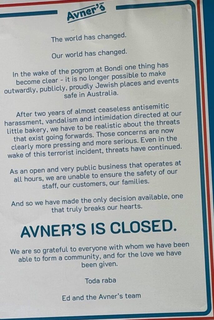 La panadería de Ed Halmagyi, Avner’s, se hizo mundialmente famosa tras el ataque de Bondi Beach. Esta historia tuvo una amplia repercusión: un día después, Halmagyi decidió cerrar Avner’s. El mensaje que dejó en la puerta fue citado en todas partes: