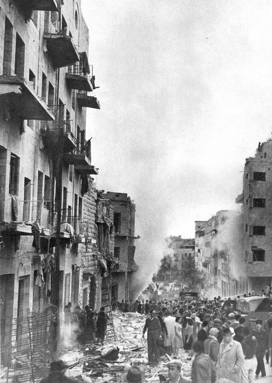 La céntrica calle Ben Yehuda de Jerusalén, tras la explosión de un coche bomba que causó más de medio centenar de muertos en febrero de 1948. Los autores de este terrible atentado fueron un árabe y dos desertores británicos (foto: United Press International)