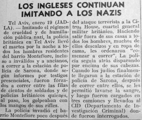 Ello podría explicar episodios como el descrito en 1947 en el semanario El Mundo Israelita —antecesor de NMI—, en un artículo titulado “Los ingleses continúan imitando a los nazis”, que se reproduce aquí.