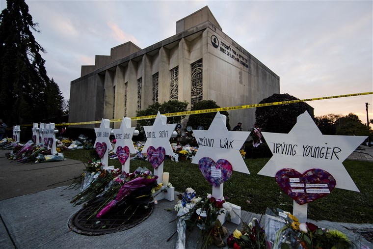 Homenaje a las 11 víctimas mortales frente a la sinagoga “Árbol de la Vida” de Pittsburgh (foto: NBS News)