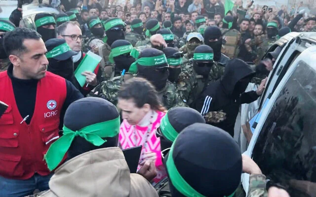 Un mar de terroristas de Hamás rodea a la rehén Doron Steinbrecher, secuestrada durante la masacre del 7 de octubre de 2023, mientras la entregan a miembros del Comité Internacional de la Cruz Roja