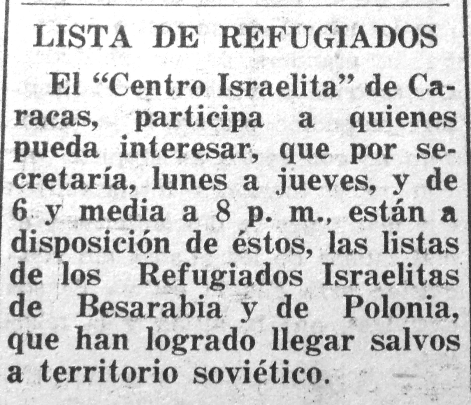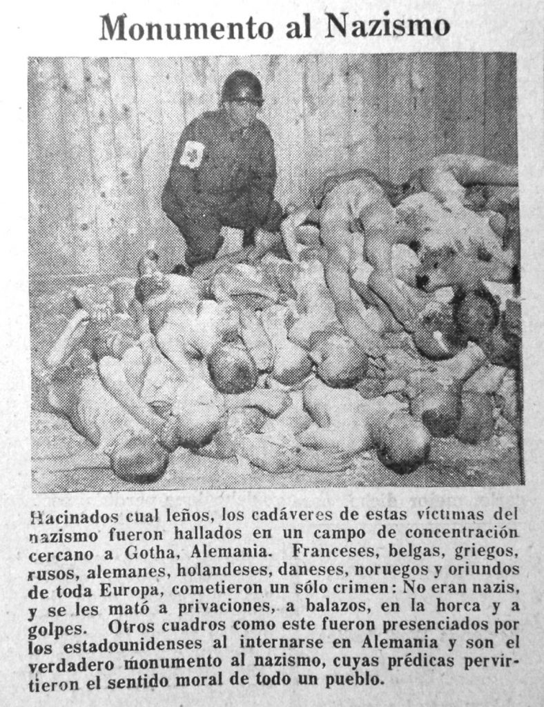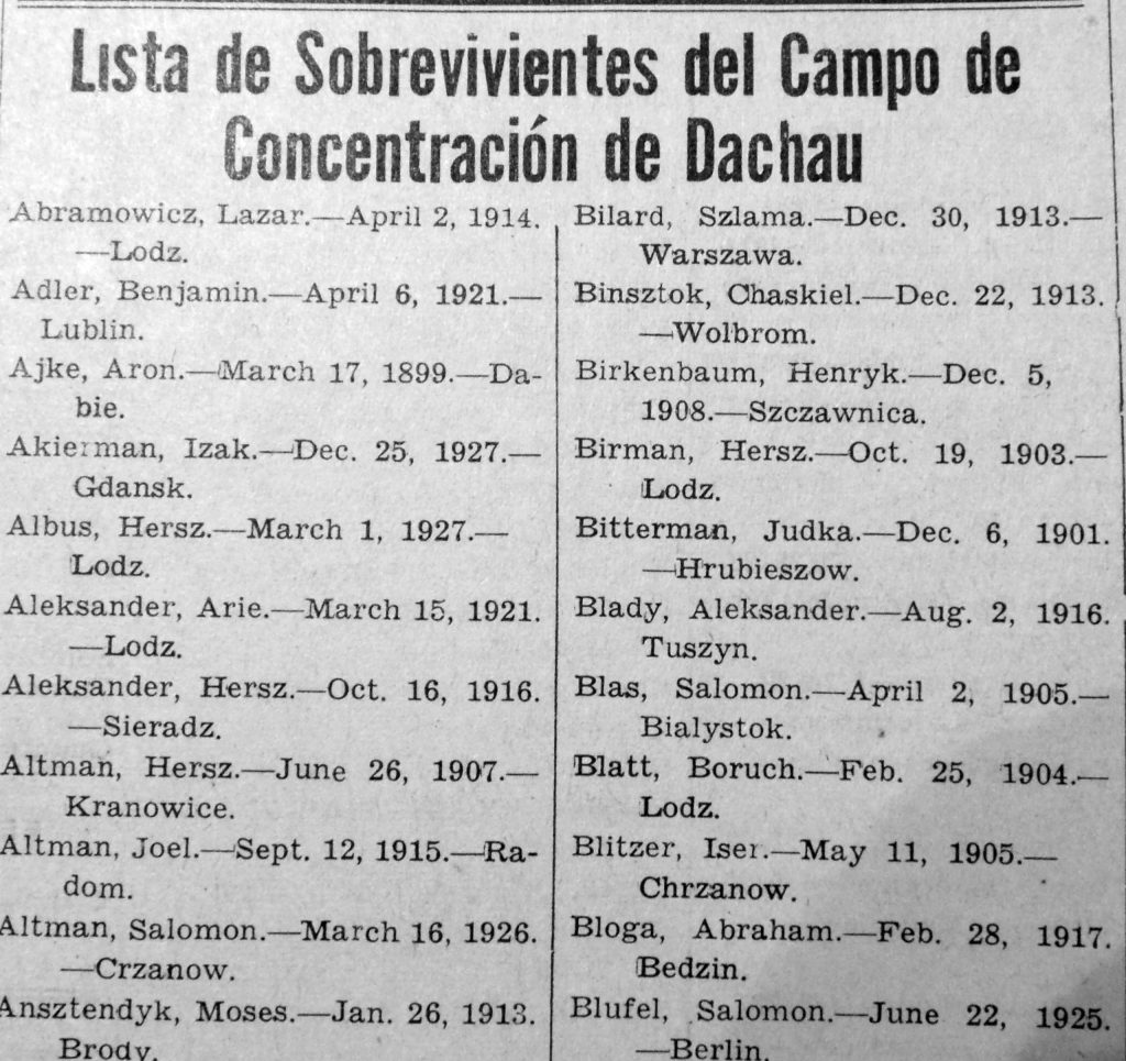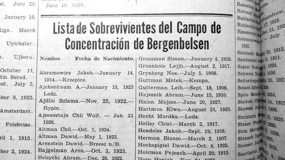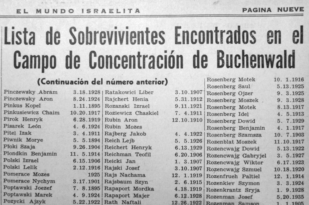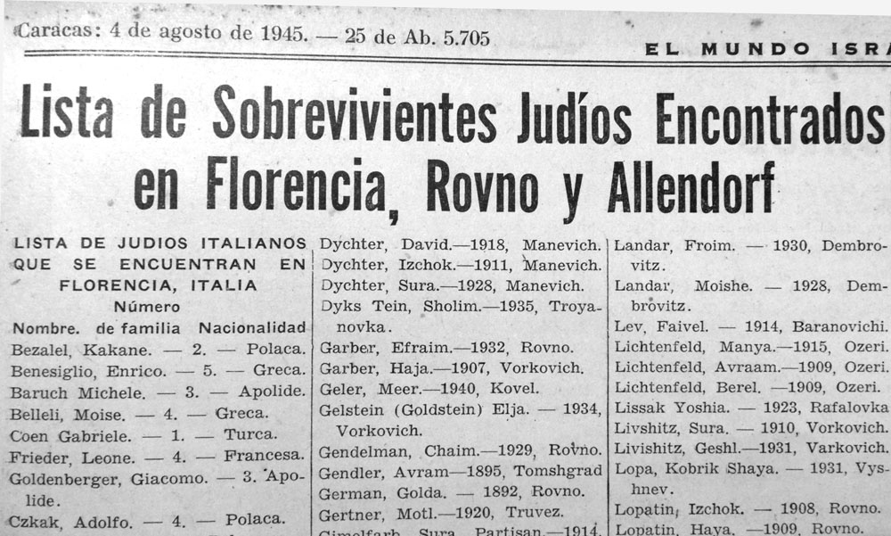 Para 1945 el tono había cambiado: ahora se veía en toda su magnitud el resultado de la catástrofe; aparecían, macilentos, quienes habían logrado salir vivos de la hecatombe. El Mundo Israelita publicó páginas y páginas llenas de listas de sobrevivientes de los campos de concentración y exterminio, de los guetos y de los escondrijos, por si acaso algún judío venezolano podría encontrar un nombre conocido y, con suerte, incluso el de algún familiar.