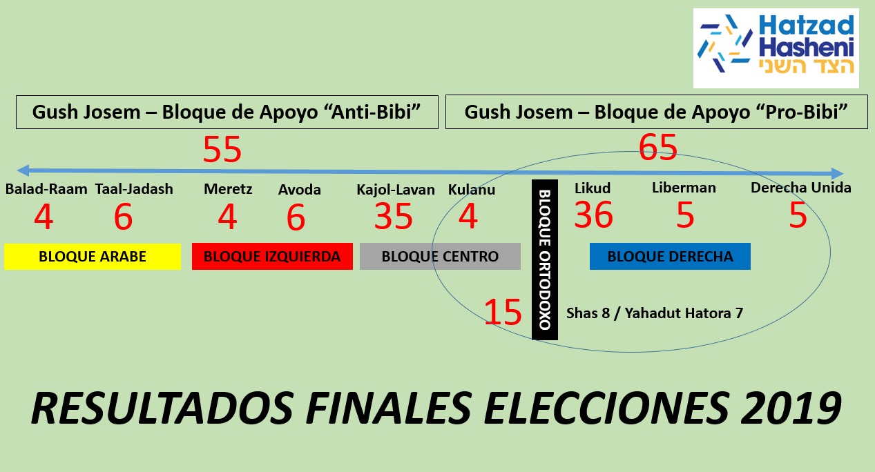 Infografía elaborada por la organización Hatzad Hashení, que sintetiza los escaños logrados por los distintos grupos políticos de Israel. (Fuente: Hatzad Hasheni)