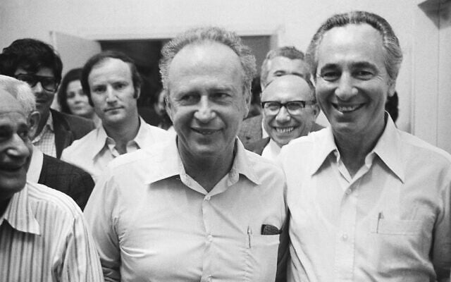 Rabin y Shimón Péres se dirigen a una sala de votación en Tel Aviv el 22 de abril de 1974, antes de que el Comité Central del Partido Laborista eligiera a Rabin para formar un nuevo gobierno