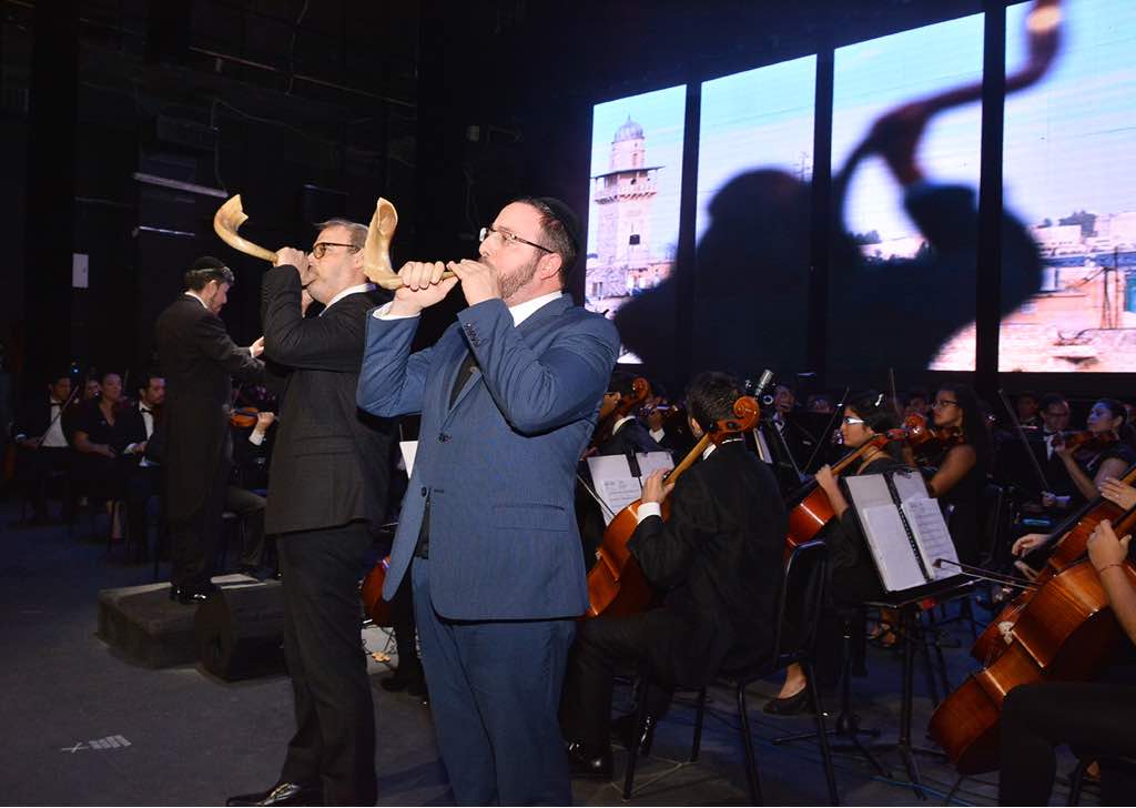 (FOTO 8): Los rabinos Eitan Weisman de la UIC y Oshri Arguane de la AIV, elevando el sonido del shofar durante la interpretación de Rajem