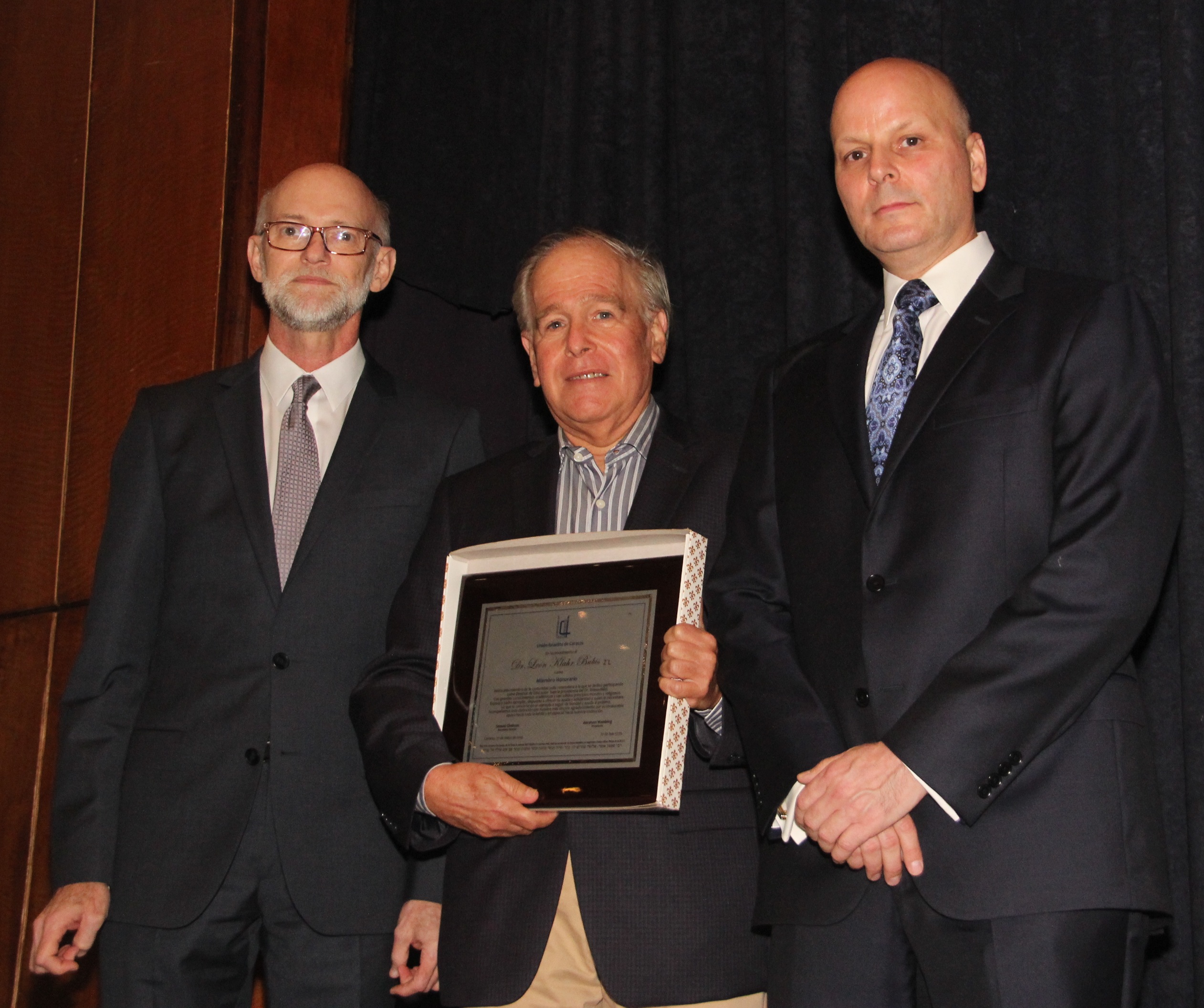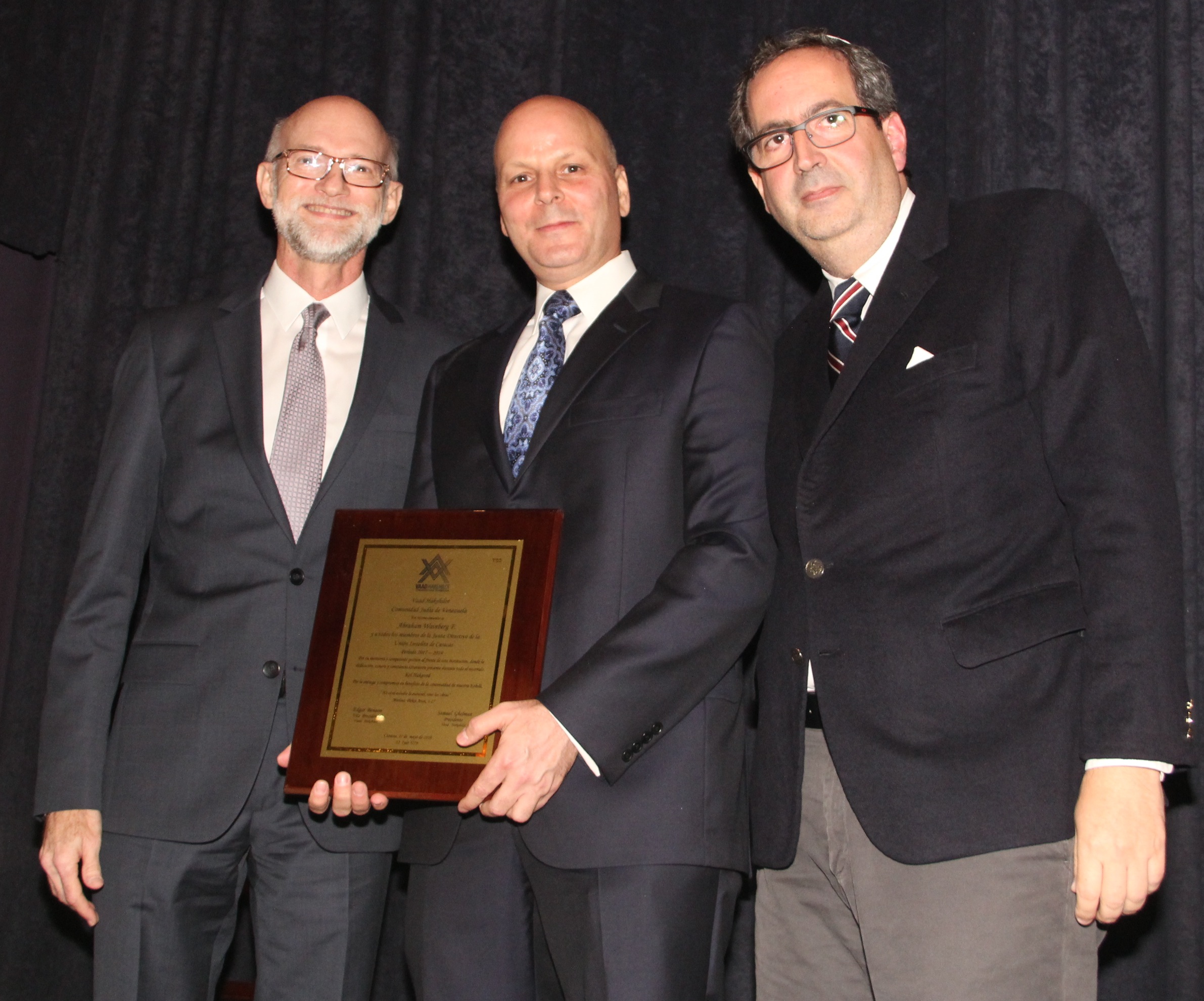 Samuel Ghelman y Edgar Benaim entregaron una placa del Vaad Hakehilot a Abraham Wainberg, presidente saliente de la UIC