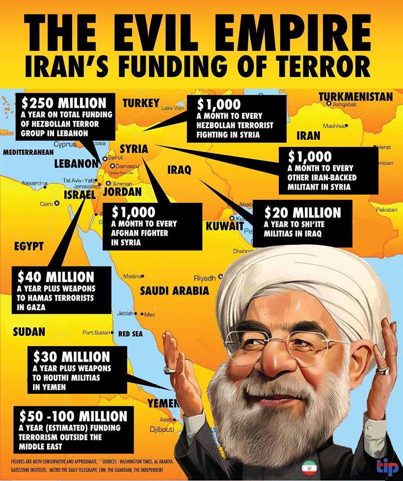 Esta infografía del portal The Israel Project, titulado “El Imperio del Mal” (recordando la manera como Ronald Reagan calificaba a la antigua Unión Soviética), resume lo que se conoce sobre el financiamiento de Irán a las actividades terroristas: 250 millones de dólares anuales para Hezbolá en el Líbano, 40 millones (además de armamento) para Hamás en Gaza, 30 millones para las milicias hutis en Yemen, 20 millones para las milicias chiítas en Iraq, y entre 50 y 100 millones para terrorismo fuera del Medio Oriente. A esto se suman mil dólares mensuales para cada terrorista chiíta en Siria, ya sea miembro de Hezbolá, de origen afgano o de otro país. Con seguridad, esto se queda corto.