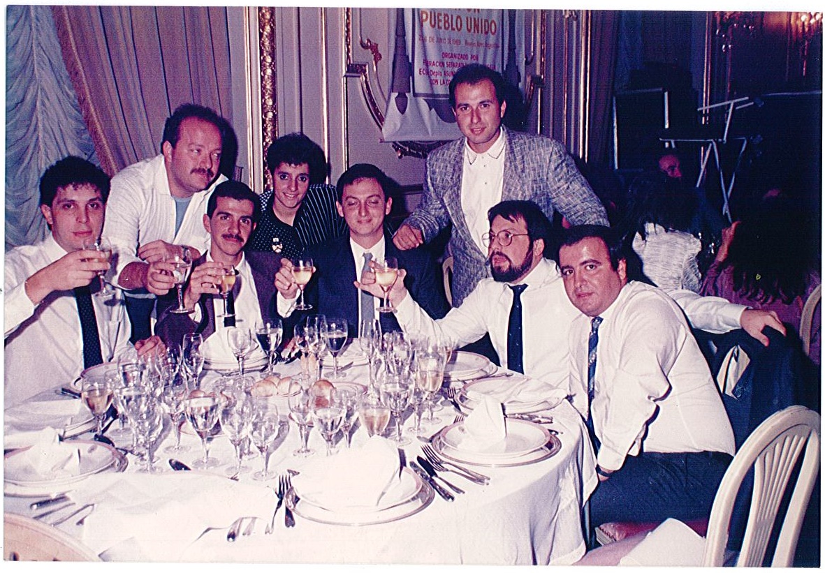 Durante el Primer Encuentro de Jóvenes de Fesela, Buenos Aires, junio de 1989: (izq. a der.) Guillermo Amar, Menahem Belilty, Alberto Moryusef, Coty Benhamu, León Benarroch, Yosi Lancry, Samuel Chocrón y David Suiza