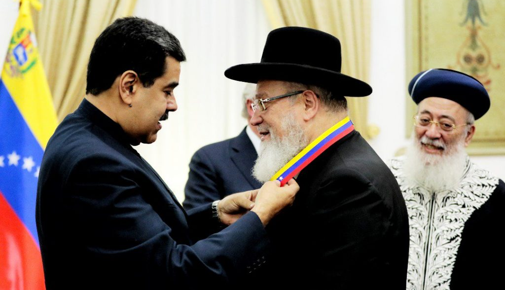 Tras el acto central, el rabino Cohen, acompañado del Gran Rabino Amar, dirigentes comunitarios y varios familiares, se dirigieron al Palacio de Miraflores, donde el presidente Nicolás Maduro le impuso a Cohen la orden “Libertadoras y Libertadores”. En el acto estuvieron también presentes la primera dama Cilia Flores, la vicepresidenta Delcy Rodríguez, el ministro de Comunicaciones Jorge Rodríguez, y el ministro del Despacho de la Presidencia, Jorge Márquez. (Foto: Aurora)