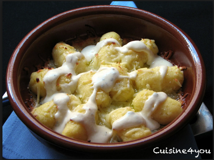 - Colocar los ñoquis en un pyrex enmantequillado, medio montar uno sobre otro.