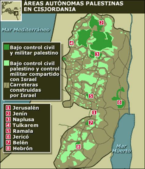 La división de Cisjordania en las áreas A (verde oscuro), B (verde claro) y C (ocre),