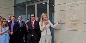 Ivanka Trump descubrió la placa inaugural de la embajada de EEUU en Jerusalén. A su lado aparece el secretario del Tesoro, Steven Mnuchin (foto: The Intercept)