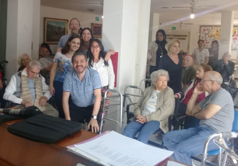 Al llegar para este sencillo agasajo, nos conseguimos a todos los abuelitos y abuelitas sentados en desordenado círculo, unos en primera fila, otros más atrás como cuando antaño asistían alegres a un circo o un espectáculo de títeres; todos arreglados, y maquilladas ellas, esperaban ansiosos disfrutar del espectáculo, con sus caras felices y atentas a lo que pronto verían al subir el telón.