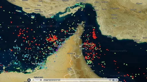 Estrecho de Ormuz. Los puntos son barcos mercantes, y se observa que muy pocos se atreven a cruzar esta arteria yugular del comercio petrolero por la que pasa el 20% del crudo mundial