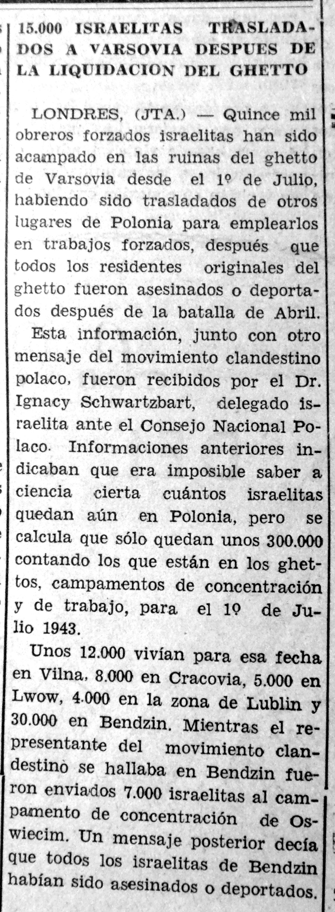 Cuando se cumplen 75 años del épico levantamiento del Gueto de Varsovia, fecha que se conmemora en Yom Hashoá, reproducimos un artículo aparecido en El Mundo Israelita unos meses más tarde, el 5 de febrero de 1944, y que durante estos tres cuartos de siglo no había vuelto a publicarse