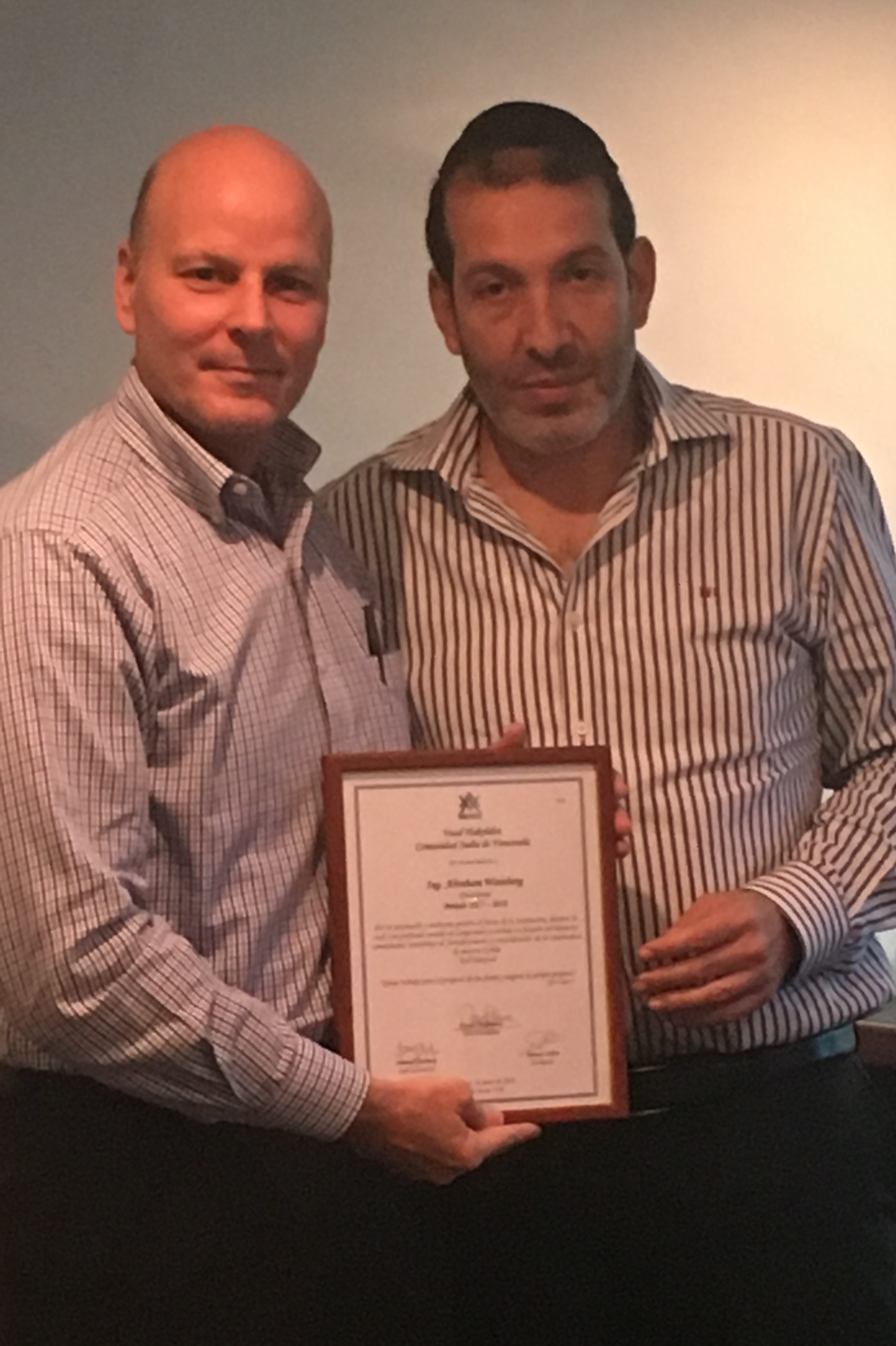 En la foto aparecen los presidentes saliente y entrante, con la placa entregada a Abraham Wainberg (izquierda).